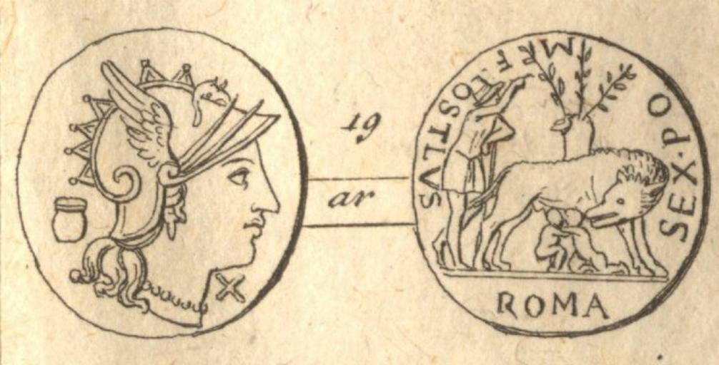 Keywords: Pompeia1.jpg 2005-12-11 own assumed Carlomorino Crawford the father of Pompeius Strabo denarius Head of Roma r <small>X</small> below chin jug behind <small> SEX ¢POM ¢FOSTLVS</small> she wolf r suckling the Twins shepherd on l birds on fig tree <small> ROMA</small> in ex Babelon Pompeia 1; Sydenham 461; Crawford 235/1a From Lezioni elementari di Numismatica antica an Italian translation of Eckhel Kurzgefasste Anfangsgründe zur alten Numismatik Vienna 1787 - Self scanned Roma - ca 137 BC - Sesto Pompeo probabilmente secondo Crawford p 267 il padre di Pompeo Strabone denario Testa di Roma dx <small>X</small> sotto la nuca vaso dietro <small>SEX ¢POM ¢FOSTLVS</small> lupa dx che allatta i Gemelli pastore sulla sin uccello picchio sul fico ruminale <small> ROMA</small> in ex Babelon Pompeia 1; Sydenham 461; Crawford 235/1a< da Lezioni elementari di Numismatica antica di Joseph Eckhel See also 200px Shepherds in art Sextus Pompeius Capitoline she-wolf on coins Ancient Roman coins Denarius Lezioni elementari di Numismatica antica |