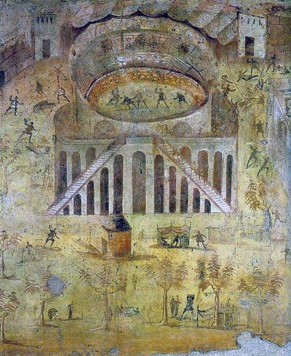 Keywords: Pompeian mural depicting the Amphitheatre riots.jpg Museo Archeologico Nazionale di Napoli inv nr 112222 Da Pompeii Casa della Rissa nell'Anfiteatro I 3 23 - L'affresco particolare anfiteatro di Pompei famosissimo è uno dei pochi che mostra un'ambientazione ed un episodio realistici E' ritratto fedelmente l'anfiteatro di Pompei con le mura della città alle sue spalle e la grande palestra con piscina centrale alla sua destra L'episodio ritratto è quello della rissa scoppiata fra Pompeiani e Nucerini nell'anno 59 d C in cui ci furono numerosi morti tanto da indurre il Senato Romano a proibire nell'anfiteatro di Pompei l'esecuzione dei giochi gladiatorii per ben dieci anni L'episodio viene narrato dallo storico Tacito Annali XIV 17 Nucerianern im Jahr 59 auf einer pompejanischen Wandmalerei Sogenannte Volksmalerei Besonders interessant ist das Sonnensegel auf der Zeichnung Das Fresco befindet sich im Museo Archeologico Nazionale Naples Robert Etienne Pompeji die eingeäscherte Stadt Ravensburg 1991 2-Dimensional made between the years 59 and 79 U D F Paris PD-old-100 Roughhouse at the Amphitheatre fresco from Pompeii 112222 |