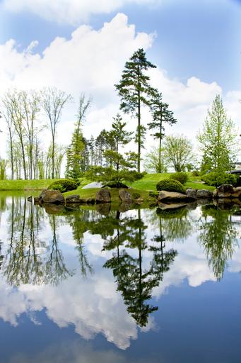 Keywords: pond lake reflection blue sky tree island water summer calm nature landscape peaceful scenery