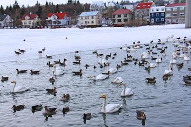 Keywords: pond lake swans ducks geese cold ice winter beautiful enchanting frost frozen tjörnin pond reykjavik iceland scandinavia europe