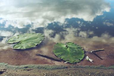 Keywords: pond leaves water mirroring clouds beach sand blue mirror reflection lake wet nature mood still water lily rest landscape loneliness still water lily pad surface atmosphere quiet waters idyll lonely recovery coast