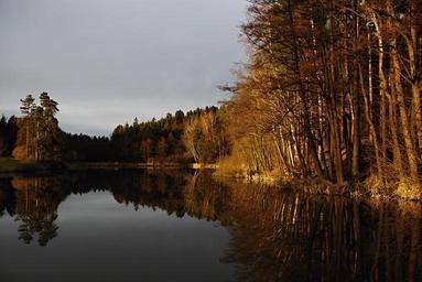 Keywords: pond surface sunset reflection trees forest edge of the pond retaining pond kačerovec ledenice