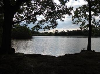 Keywords: pond view trees shrubs water it reflects the sun