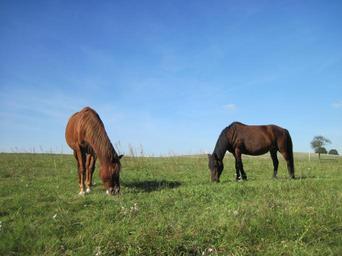 Keywords: ponies graze pasture relaxed brown fuchs sky summer meadow