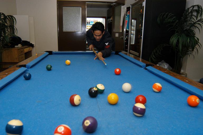 Keywords: Pool game aboard USS Fort McHenry.jpg en U S Fleet Activities Sasebo Japan Mar 15 2005 - Ship's Serviceman 2nd Class Neil Mendoza assigned to Transient Personnel Detachment TPD on board U S Fleet Activities Sasebo Japan lines up his shot during a game of pool in the building lounge Petty Officer Mendoza is assigned to the amphibious dock landing ship USS Fort McHenry LSD 43 and is currently in TPD awaiting the arrival of the ship U S Navy photo by Photographer's Mate 3rd Class Yesenia Rosas RELEASED 2005-03-15 050315-N-2385R-009 Navy http //www navy mil/view_image asp id 22758 U S Navy photo by Photographer's Mate 3rd Class Yesenia Rosas PD-USGov-Military-Navy Aboard USS Fort McHenry LSD-43 Billiards players United States Fleet Activities Sasebo |
