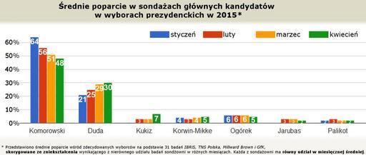 | Keywords: Poparcie sondażowe głównych kandydatów na prezydenta Polski w wyborach w 2015 roku.png pl Przedstawiono średnie poparcie wśród zdecydowanych wyborców na podstawie 31 badań IBRiS TNS Polska Millward Brown i GfK skotygowane ze zniekształcenia wynikajacego z nierównego udziału badań badań sondażowni w rónych miesiącach Każda z sondażowni ma rózny udział w miesięcznej sredniej own Szczeciniarz 2015-05-02 Polish presidential elections 2015 Cc-zero | ||||