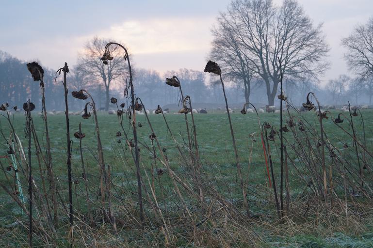 Keywords: poppies dry meadow nature winter morning winter morning flock of sheep fog frost morning frost