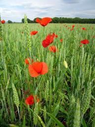 Keywords: poppies field wheat poppy red flowers summer field of flowers green bloom flora green field wild papaver wildflowers countryside landscape