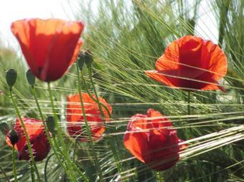 Keywords: wheat grain ears red poppies spring flowers field corn field corn poppies spring flowers
