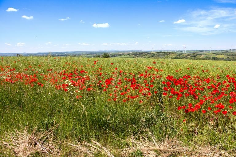 Keywords: poppy meadow poppy klatschmohn lower austria fields green landscape austria sky spring flower meadow plant blue blossomed flowers