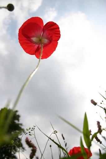 Keywords: poppy sky blue red flowers field cloudy sky light summer flowering clouds fleurs des champs field of poppies spring