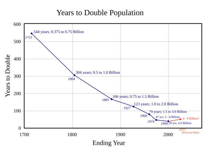 Keywords: Population-doubling.svg data in 'World Population' article showing number of years taken for World Population to double Two series are interleaved one starting from 0 25 billion the other from 0 375 billion Both the graph and table upon which it is based clearly show the number of years taken for the population to double has been constantly decreasing although current forecasts for future doubling do not Each time the population doubles the actual increase is of course very significantly more than for the previous doubling datos en el artículo 'World Population' que muestran el número de años que le toma a la población mundial duplicarse Se muestra que el número de años que toma a la población mundial duplicarse ha disminuido monótonamente aunque algunas estimaciones muestran que en el futuro no sería así Cada vez que la població se duplica el incremento es mayor a los anteriores Population-doubling jpg 50 2013-04-12 16 31 UTC User Nicoguaro Vectorized version Nicoguaro Population-doubling jpg Uploaded with derivativeFX World population statistics |