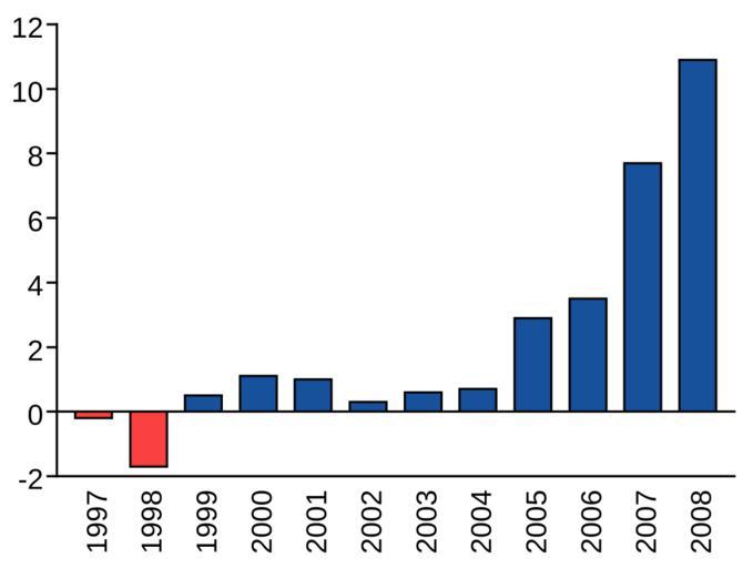 | Keywords: Population growth-SLO.svg en Total population growth in Slovenia per 1000 residents including births/deaths and migrations Source http //www stat si/pxweb/Dialog/varval asp ma 0515501S ti Naravno+gibanje+in+skupni+prirast+prebivalstva+po+ob E8inah+ 28absolutni+podatki+in+kazalniki 29 2C+Slovenija 2C+letno path /Database/Dem_soc/05_prebivalstvo/03_05155_nar_gib/00_05155_kazalniki/ lang 2 Statistical office of the Republic of Slovenia sl Celotni prirast prebivalstva na 1000 prebivalcev v Sloveniji vključujoč rojstva/smrti in migracije Vir http //www stat si/pxweb/Dialog/varval asp ma 0515501S ti Naravno+gibanje+in+skupni+prirast+prebivalstva+po+ob E8inah+ 28absolutni+podatki+in+kazalniki 29 2C+Slovenija 2C+letno path /Database/Dem_soc/05_prebivalstvo/03_05155_nar_gib/00_05155_kazalniki/ lang 2 Statistični urad Republike Slovenije own Yerpo 2010-08-26 Raw data wikitable - Year Growth - 1997 -0 2 - 1998 -1 7 - 1999 0 5 - 2000 1 1 - 2001 1 - 2002 0 3 - 2003 0 6 - 2004 0 7 - 2005 2 9 - 2006 3 5 - 2007 7 7 - 2008 10 9 Demographics of Slovenia Files by User Yerpo Rates of natural increase |