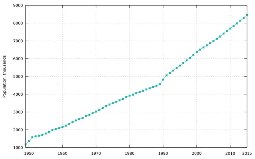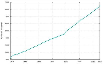 | Keywords: Population of Israel since 1949.svg en Israel's population 1949-2015 Own work by uploader Gnuplot Demmo 2016-11-17 File Israel-demography png Temporal population graphs of Israel Israel Charts of Israel Sources en Israel Central Bureau of Statistics http //www cbs gov il/ts/databank/databank_main_func_e html Time series - DataBank - Population de Jure At End of Period Total Gnuplot Version 4 4 patchlevel 2 <source lang gnuplot > set term svg size 800 500 dynamic font sans-serif set autoscale xfix set grid set style data linespoints set pointsize 0 6 unset key set ylabel Population thousands set xtics add 2015 Added for clarity may be omitted if necessary plot population txt linetype rgb 20B2AA pt 5 </source> Data file population txt <pre> 1949 1173 9 1950 1370 1 1951 1577 8 1952 1629 5 1953 1669 4 1954 1717 8 1955 1789 1 1956 1872 4 1957 1976 1958 2031 7 1959 2088 7 1960 2150 4 1961 2234 2 1962 2331 8 1963 2430 1 1964 2525 6 1965 2598 4 1966 2657 4 1967 2776 3 1968 2841 1 1969 2929 5 1970 3022 1 1971 3120 7 1972 3225 1973 3338 2 1974 3421 6 1975 3493 2 1976 3575 4 1977 3653 2 1978 3737 6 1979 3836 2 1980 3921 7 1981 3977 7 1982 4063 6 1983 4118 6 1984 4199 7 1985 4266 2 1986 4331 3 1987 4406 5 1988 4476 8 1989 4559 6 1990 4821 7 1991 5058 8 1992 5195 9 1993 5327 6 1994 5471 5 1995 5612 3 1996 5757 9 1997 5900 1998 6041 4 1999 6209 1 2000 6369 3 2001 6508 8 2002 6631 1 2003 6748 4 2004 6869 5 2005 6990 7 2006 7116 7 2007 7243 6 2008 7412 2 2009 7552 2010 7695 1 2011 7836 6 2012 7981 4 2013 8134 5 2014 8296 6 2015 8463 4 </pre> |