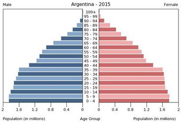 | Keywords: Population pyramid of Argentina 2015.png en A population pyramid illustrates the age and sex structure of population and may provide insights about political and social stability as well as economic development The population is distributed along the horizontal axis with males shown on the left and females on the right The male and female populations are broken down into 5-year age groups represented as horizontal bars along the vertical axis with the youngest age groups at the bottom and the oldest at the top The shape of the population pyramid gradually evolves over time based on fertility mortality and international migration trends Віково-статева пі аміда населення А гентини за 2015 ік Вона дає наочне уявлення п о вікову і статеву ст укту а населення к аїни може слугувати дже елом інфо мації п о політичну і соціальну стабільність економічний озвиток Блакитними кольо ами ліво уч у вигляді го изонтальних смуг показані вікові г упи по 5 оків кожна чоловічої статі п аво уч ожевими жіночої аймолодші вікові г упи внизу найста іші вго і Фо ма пі аміди поступово еволюціонує з плином часу під впливом чинників на оджуваності сме тності і світової міг ації https //www cia gov/library/publications/the-world-factbook/ The World Factbook 2016-09-21 The Central Intelligence Agency Цент альне озвідувальне уп авління PD-USGov Population pyramids of Argentina |