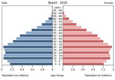 | Keywords: Population pyramid of Brazil 2015.png en A population pyramid illustrates the age and sex structure of population and may provide insights about political and social stability as well as economic development The population is distributed along the horizontal axis with males shown on the left and females on the right The male and female populations are broken down into 5-year age groups represented as horizontal bars along the vertical axis with the youngest age groups at the bottom and the oldest at the top The shape of the population pyramid gradually evolves over time based on fertility mortality and international migration trends Віково-статева пі аміда населення Б азилії за 2015 ік Вона дає наочне уявлення п о вікову і статеву ст укту а населення к аїни може слугувати дже елом інфо мації п о політичну і соціальну стабільність економічний озвиток Блакитними кольо ами ліво уч у вигляді го изонтальних смуг показані вікові г упи по 5 оків кожна чоловічої статі п аво уч ожевими жіночої аймолодші вікові г упи внизу найста іші вго і Фо ма пі аміди поступово еволюціонує з плином часу під впливом чинників на оджуваності сме тності і світової міг ації https //www cia gov/library/publications/the-world-factbook/ The World Factbook 2016-09-21 The Central Intelligence Agency Цент альне озвідувальне уп авління PD-USGov Population pyramids of Brazil |