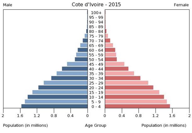 | Keywords: Population pyramid of Cote d'Ivoire 2015.png en A population pyramid illustrates the age and sex structure of population and may provide insights about political and social stability as well as economic development The population is distributed along the horizontal axis with males shown on the left and females on the right The male and female populations are broken down into 5-year age groups represented as horizontal bars along the vertical axis with the youngest age groups at the bottom and the oldest at the top The shape of the population pyramid gradually evolves over time based on fertility mortality and international migration trends Віково-статева пі аміда населення Кот-д'Івуа у за 2015 ік Вона дає наочне уявлення п о вікову і статеву ст укту а населення к аїни може слугувати дже елом інфо мації п о політичну і соціальну стабільність економічний озвиток Блакитними кольо ами ліво уч у вигляді го изонтальних смуг показані вікові г упи по 5 оків кожна чоловічої статі п аво уч ожевими жіночої аймолодші вікові г упи внизу найста іші вго і Фо ма пі аміди поступово еволюціонує з плином часу під впливом чинників на оджуваності сме тності і світової міг ації https //www cia gov/library/publications/the-world-factbook/ The World Factbook 2016-09-21 The Central Intelligence Agency Цент альне озвідувальне уп авління PD-USGov Population pyramids of Cote d'Ivoire |