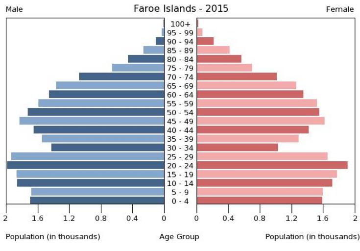 | Keywords: Population pyramid of Faroe Islands 2015.png en A population pyramid illustrates the age and sex structure of population and may provide insights about political and social stability as well as economic development The population is distributed along the horizontal axis with males shown on the left and females on the right The male and female populations are broken down into 5-year age groups represented as horizontal bars along the vertical axis with the youngest age groups at the bottom and the oldest at the top The shape of the population pyramid gradually evolves over time based on fertility mortality and international migration trends Віково-статева пі аміда населення Фа е ських Ост овів за 2015 ік Вона дає наочне уявлення п о вікову і статеву ст укту а населення к аїни може слугувати дже елом інфо мації п о політичну і соціальну стабільність економічний озвиток Блакитними кольо ами ліво уч у вигляді го изонтальних смуг показані вікові г упи по 5 оків кожна чоловічої статі п аво уч ожевими жіночої аймолодші вікові г упи внизу найста іші вго і Фо ма пі аміди поступово еволюціонує з плином часу під впливом чинників на оджуваності сме тності і світової міг ації https //www cia gov/library/publications/the-world-factbook/ The World Factbook 2016-09-21 The Central Intelligence Agency Цент альне озвідувальне уп авління PD-USGov Population pyramids of Faroe Islands |