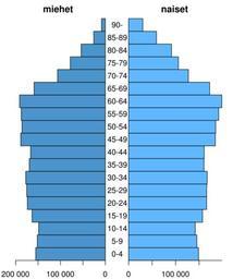 | Keywords: Population pyramid of Finland 2012.svg en Finnish population by age and gender end of 2012 Men left dark blue / Women right light blue fi Suomen väestö iän ja sukupuolen mukaan vuoden 2012 lopussa Miehet vasen tumman sininen / Naiset oikea vaalean sininen 2013-04-29 20 26 24 Data from http //www tilastokeskus fi/tup/suoluk/suoluk_vaesto_en html Statistics Finland Population by age group end of 2012 graph generated by R Qtea R source Modified from File Fin population by age 2005 png by User Jkv <pre> m <- c 155281 151706 148569 163421 173775 175226 177454 169502 166649 188707 185863 187478 191222 158967 106568 78139 53901 25782 8412 w <- c 148802 145274 141760 157292 165983 166069 167305 160340 160821 184591 185308 191717 198366 172561 127231 105940 91302 59277 30113 a <- c 0-4 5-9 10-14 15-19 20-24 25-29 30-34 35-39 40-44 45-49 50-54 55-59 60-64 65-69 70-74 75-79 80-84 85-89 90- svg fin_population_by_age svg width 5 height 5 1 2 par mfcol c 1 2 mar c 2 1 2 2 1 2 y <- barplot -m space 0 horiz T xlim c -210000 0 axes F yaxs i col steelblue3 title main miehet cex 8 axis 1 at -4 0 50000 labels c 200 000 100 000 0 barplot w space 0 horiz T axes F yaxs i col steelblue1 axis 1 at 0 4 50000 labels c 0 100 000 200 000 title main naiset cex 8 axis 2 at y labels a tick F las 1 line 1 hadj 5 dev off </pre> cc-zero Uploaded with UploadWizard Population pyramids of Finland |