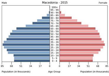 | Keywords: Population pyramid of Macedonia 2015.png en A population pyramid illustrates the age and sex structure of population and may provide insights about political and social stability as well as economic development The population is distributed along the horizontal axis with males shown on the left and females on the right The male and female populations are broken down into 5-year age groups represented as horizontal bars along the vertical axis with the youngest age groups at the bottom and the oldest at the top The shape of the population pyramid gradually evolves over time based on fertility mortality and international migration trends Віково-статева пі аміда населення Республіки акедонія за 2015 ік Вона дає наочне уявлення п о вікову і статеву ст укту а населення к аїни може слугувати дже елом інфо мації п о політичну і соціальну стабільність економічний озвиток Блакитними кольо ами ліво уч у вигляді го изонтальних смуг показані вікові г упи по 5 оків кожна чоловічої статі п аво уч ожевими жіночої аймолодші вікові г упи внизу найста іші вго і Фо ма пі аміди поступово еволюціонує з плином часу під впливом чинників на оджуваності сме тності і світової міг ації https //www cia gov/library/publications/the-world-factbook/ The World Factbook 2016-09-21 The Central Intelligence Agency Цент альне озвідувальне уп авління PD-USGov Population pyramids of Macedonia |