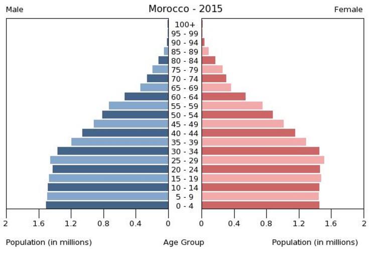 Keywords: Population pyramid of Morocco 2015.png en A population pyramid illustrates the age and sex structure of population and may provide insights about political and social stability as well as economic development The population is distributed along the horizontal axis with males shown on the left and females on the right The male and female populations are broken down into 5-year age groups represented as horizontal bars along the vertical axis with the youngest age groups at the bottom and the oldest at the top The shape of the population pyramid gradually evolves over time based on fertility mortality and international migration trends Віково-статева пі аміда населення а окко за 2015 ік Вона дає наочне уявлення п о вікову і статеву ст укту а населення к аїни може слугувати дже елом інфо мації п о політичну і соціальну стабільність економічний озвиток Блакитними кольо ами ліво уч у вигляді го изонтальних смуг показані вікові г упи по 5 оків кожна чоловічої статі п аво уч ожевими жіночої аймолодші вікові г упи внизу найста іші вго і Фо ма пі аміди поступово еволюціонує з плином часу під впливом чинників на оджуваності сме тності і світової міг ації https //www cia gov/library/publications/the-world-factbook/ The World Factbook 2016-09-21 The Central Intelligence Agency Цент альне озвідувальне уп авління PD-USGov Population pyramids of Morocco |