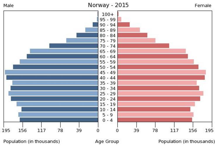 Keywords: Population pyramid of Norway 2015.png en A population pyramid illustrates the age and sex structure of population and may provide insights about political and social stability as well as economic development The population is distributed along the horizontal axis with males shown on the left and females on the right The male and female populations are broken down into 5-year age groups represented as horizontal bars along the vertical axis with the youngest age groups at the bottom and the oldest at the top The shape of the population pyramid gradually evolves over time based on fertility mortality and international migration trends Віково-статева пі аміда населення о вегії за 2015 ік Вона дає наочне уявлення п о вікову і статеву ст укту а населення к аїни може слугувати дже елом інфо мації п о політичну і соціальну стабільність економічний озвиток Блакитними кольо ами ліво уч у вигляді го изонтальних смуг показані вікові г упи по 5 оків кожна чоловічої статі п аво уч ожевими жіночої аймолодші вікові г упи внизу найста іші вго і Фо ма пі аміди поступово еволюціонує з плином часу під впливом чинників на оджуваності сме тності і світової міг ації https //www cia gov/library/publications/the-world-factbook/ The World Factbook 2016-09-21 The Central Intelligence Agency Цент альне озвідувальне уп авління PD-USGov Population pyramids of Norway |