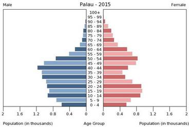 | Keywords: Population pyramid of Palau 2015.png en A population pyramid illustrates the age and sex structure of population and may provide insights about political and social stability as well as economic development The population is distributed along the horizontal axis with males shown on the left and females on the right The male and female populations are broken down into 5-year age groups represented as horizontal bars along the vertical axis with the youngest age groups at the bottom and the oldest at the top The shape of the population pyramid gradually evolves over time based on fertility mortality and international migration trends Віково-статева пі аміда населення Палау за 2015 ік Вона дає наочне уявлення п о вікову і статеву ст укту а населення к аїни може слугувати дже елом інфо мації п о політичну і соціальну стабільність економічний озвиток Блакитними кольо ами ліво уч у вигляді го изонтальних смуг показані вікові г упи по 5 оків кожна чоловічої статі п аво уч ожевими жіночої аймолодші вікові г упи внизу найста іші вго і Фо ма пі аміди поступово еволюціонує з плином часу під впливом чинників на оджуваності сме тності і світової міг ації https //www cia gov/library/publications/the-world-factbook/ The World Factbook 2016-09-21 The Central Intelligence Agency Цент альне озвідувальне уп авління PD-USGov Population pyramids of Palau |