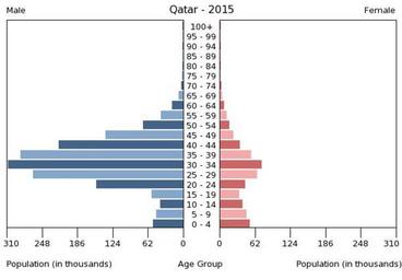 | Keywords: Population pyramid of Qatar 2015.png en A population pyramid illustrates the age and sex structure of population and may provide insights about political and social stability as well as economic development The population is distributed along the horizontal axis with males shown on the left and females on the right The male and female populations are broken down into 5-year age groups represented as horizontal bars along the vertical axis with the youngest age groups at the bottom and the oldest at the top The shape of the population pyramid gradually evolves over time based on fertility mortality and international migration trends Віково-статева пі аміда населення Ката у за 2015 ік Вона дає наочне уявлення п о вікову і статеву ст укту а населення к аїни може слугувати дже елом інфо мації п о політичну і соціальну стабільність економічний озвиток Блакитними кольо ами ліво уч у вигляді го изонтальних смуг показані вікові г упи по 5 оків кожна чоловічої статі п аво уч ожевими жіночої аймолодші вікові г упи внизу найста іші вго і Фо ма пі аміди поступово еволюціонує з плином часу під впливом чинників на оджуваності сме тності і світової міг ації https //www cia gov/library/publications/the-world-factbook/ The World Factbook 2016-09-21 The Central Intelligence Agency Цент альне озвідувальне уп авління PD-USGov Population pyramids of Qatar |
