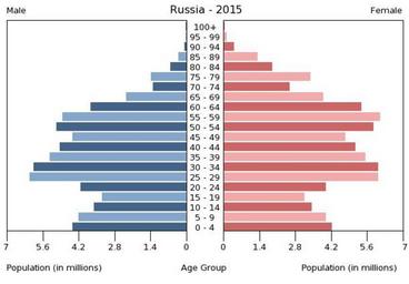 | Keywords: Population pyramid of Russia 2015.png en A population pyramid illustrates the age and sex structure of population and may provide insights about political and social stability as well as economic development The population is distributed along the horizontal axis with males shown on the left and females on the right The male and female populations are broken down into 5-year age groups represented as horizontal bars along the vertical axis with the youngest age groups at the bottom and the oldest at the top The shape of the population pyramid gradually evolves over time based on fertility mortality and international migration trends Віково-статева пі аміда населення Росії за 2015 ік Вона дає наочне уявлення п о вікову і статеву ст укту а населення к аїни може слугувати дже елом інфо мації п о політичну і соціальну стабільність економічний озвиток Блакитними кольо ами ліво уч у вигляді го изонтальних смуг показані вікові г упи по 5 оків кожна чоловічої статі п аво уч ожевими жіночої аймолодші вікові г упи внизу найста іші вго і Фо ма пі аміди поступово еволюціонує з плином часу під впливом чинників на оджуваності сме тності і світової міг ації https //www cia gov/library/publications/the-world-factbook/ The World Factbook 2016-09-21 The Central Intelligence Agency Цент альне озвідувальне уп авління PD-USGov Population pyramids of Russia |