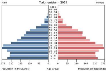 | Keywords: Population pyramid of Turkmenistan 2015.png en A population pyramid illustrates the age and sex structure of population and may provide insights about political and social stability as well as economic development The population is distributed along the horizontal axis with males shown on the left and females on the right The male and female populations are broken down into 5-year age groups represented as horizontal bars along the vertical axis with the youngest age groups at the bottom and the oldest at the top The shape of the population pyramid gradually evolves over time based on fertility mortality and international migration trends Віково-статева пі аміда населення Ту кменістану за 2015 ік Вона дає наочне уявлення п о вікову і статеву ст укту а населення к аїни може слугувати дже елом інфо мації п о політичну і соціальну стабільність економічний озвиток Блакитними кольо ами ліво уч у вигляді го изонтальних смуг показані вікові г упи по 5 оків кожна чоловічої статі п аво уч ожевими жіночої аймолодші вікові г упи внизу найста іші вго і Фо ма пі аміди поступово еволюціонує з плином часу під впливом чинників на оджуваності сме тності і світової міг ації https //www cia gov/library/publications/the-world-factbook/ The World Factbook 2016-09-21 The Central Intelligence Agency Цент альне озвідувальне уп авління PD-USGov Population pyramids of Turkmenistan |