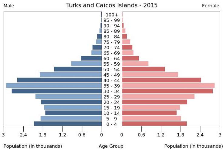 | Keywords: Population pyramid of Turks and Caicos Islands 2015.png en A population pyramid illustrates the age and sex structure of population and may provide insights about political and social stability as well as economic development The population is distributed along the horizontal axis with males shown on the left and females on the right The male and female populations are broken down into 5-year age groups represented as horizontal bars along the vertical axis with the youngest age groups at the bottom and the oldest at the top The shape of the population pyramid gradually evolves over time based on fertility mortality and international migration trends Віково-статева пі аміда населення Ост овів Те кс і Кайкос за 2015 ік Вона дає наочне уявлення п о вікову і статеву ст укту а населення к аїни може слугувати дже елом інфо мації п о політичну і соціальну стабільність економічний озвиток Блакитними кольо ами ліво уч у вигляді го изонтальних смуг показані вікові г упи по 5 оків кожна чоловічої статі п аво уч ожевими жіночої аймолодші вікові г упи внизу найста іші вго і Фо ма пі аміди поступово еволюціонує з плином часу під впливом чинників на оджуваності сме тності і світової міг ації https //www cia gov/library/publications/the-world-factbook/ The World Factbook 2016-09-21 The Central Intelligence Agency Цент альне озвідувальне уп авління PD-USGov Population pyramids of Turks and Caicos Islands |