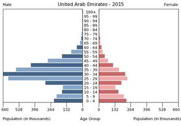 | Keywords: Population pyramid of United Arab Emirates 2015.png en A population pyramid illustrates the age and sex structure of population and may provide insights about political and social stability as well as economic development The population is distributed along the horizontal axis with males shown on the left and females on the right The male and female populations are broken down into 5-year age groups represented as horizontal bars along the vertical axis with the youngest age groups at the bottom and the oldest at the top The shape of the population pyramid gradually evolves over time based on fertility mortality and international migration trends Віково-статева пі аміда населення Об'єднаних А абських Емі атів за 2015 ік Вона дає наочне уявлення п о вікову і статеву ст укту а населення к аїни може слугувати дже елом інфо мації п о політичну і соціальну стабільність економічний озвиток Блакитними кольо ами ліво уч у вигляді го изонтальних смуг показані вікові г упи по 5 оків кожна чоловічої статі п аво уч ожевими жіночої аймолодші вікові г упи внизу найста іші вго і Фо ма пі аміди поступово еволюціонує з плином часу під впливом чинників на оджуваності сме тності і світової міг ації https //www cia gov/library/publications/the-world-factbook/ The World Factbook 2016-09-21 The Central Intelligence Agency Цент альне озвідувальне уп авління PD-USGov Population pyramids of the United Arab Emirates |