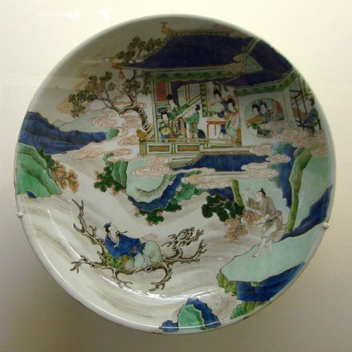 | Keywords: Porcelaine chinoise Guimet 281103.jpg Plat représentant des femmes dans un pavillon avec au 1er plan le poète Li Po naviguant sur un tronc d'arbre évoquant un dragon; dynastie Qing période Kangxi 1662-1722 Musée Guimet Paris Own 2007-11-27 Vassil Porcelain of China in Musée Guimet Porcelains of the Qing Dynasty |