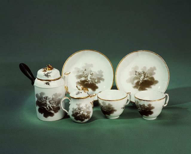 | Keywords: Porslin - Hallwylska museet - 82292.tif Frukostservis déjeuner för två personer bestående av kaffekanna med handtag av ebenholts gräddkanna båda med lock två koppar med fat samt rund bricka Gemensam dekor i form av amoriner bland moln samt strödda blommor i en gråbrun camaïeu över glasyren Kaffekannan har en rak nyklassisk form med utstående handtag av trä i en modell som förekom i samtida silverkaffekannor Pipen är högt placerad för att undvika att få sump i koppen Kopparna är djupa med mjukt formad profil som var den klassiska formen för kaffekopp innan den raka nyklassiska koppen slog igenom Gräddkannan är bullig i mjukare rokokoform och brickans rokokokartuscher inramade med guldstoffering Servisen visar att man vid denna tid hade olika stilar som kombinerades kanske utifrån kundens eget önskemål Dekoren är målad en camaïeu det vill säga monokromt i lavering i sepia En pärlbård och blomranka i guldstoffering förhöjer intrycket Det målade motivet är putti som skjuter kärlekspilar bland moln En dekorationsskiss av P H B Lehmann inlagt i ett brev daterat Berlin 13 april 1780 visar samma motiv Lehmann var en av tre emaljmålare från manufakturen i Berlin som 1780 erbjöd sina tjänster och skickade brev med teckningsprov till köpenhamnsfabrikens ledare Müller Specialisten inom puttigenren var framför allt F C Camradt vars måleri hade stick av Boucher som förebild Förutom Camradt var Lehmann som korrespondensen visar en av målarna i denna genre Tillsammans kom de tre Berlinmålarna att göra en viktig insats för att säkra kvaliteten på måleriet Genom sin undervisning av fabrikens målare och lärlingar hade de stort inflytande på utvecklingen av blomstermåleriet på det danska porslinet original caption Porslin end other date century 18 size cm 5 3 koppar size cm 8 4 gräddkanna size cm 12 3 kaffekannan size cm 12 8 fat size cm 31 1 bricka HWY place of origin Den Kongelige Porcelainsfabrik Köpenhamn DK original filename hm_t010836 17433 inventory number HWY XLVII I B i 01 82292 CC-BY-SA Samuel Uhrdin <gallery caption Different images of same object > File Porslin - Hallwylska museet - 30932 tif File Porslin - Hallwylska museet - 13807 tif </gallery> Samuel Uhrdin Porcelain in the Hallwyl museum Media contributed by LSH dim-with multiple size templates Media contributed by LSH 2013-10 |