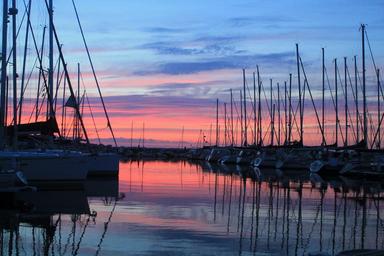 Keywords: port boats ships sunset sun red blue mirroring water lights sailing boats yachts evening web marina mood quiet colorful holiday