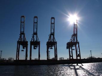 Keywords: port cranes hamburg port elbe harbour cranes river water technology crane ship transport shipping container ship