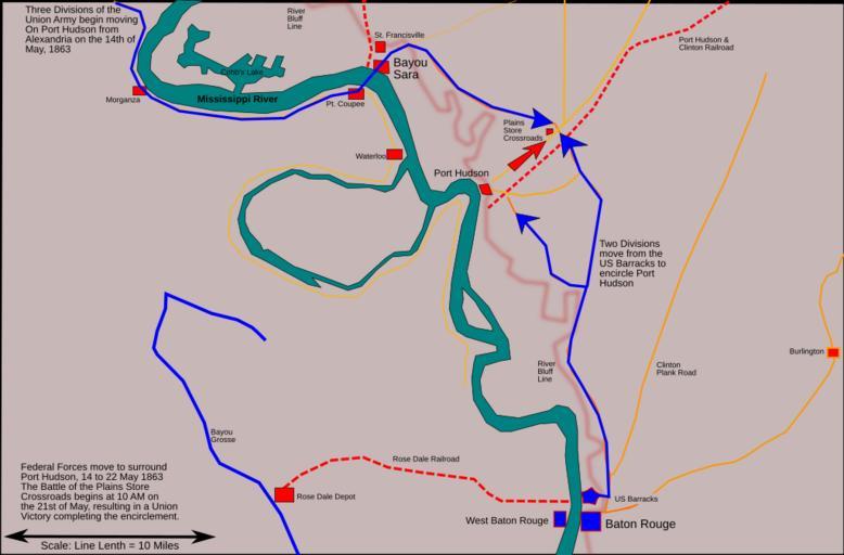 Keywords: Port Hudson Plains Store Four.svg en Sketch map showing the movement of Union forces to invest the Confederate fortifications of Port Hudson Louisiana May 14-22 1863 own Calendar5 2011-02-28 Port_Hudson_Plains_Store_Three png Cc-zero Maps showing 19th-century history |