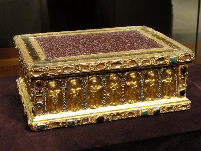 | Keywords: Portable Altar of Countess Gertrude, shortly after 1038, from the Guelph Treasure, German, Lower Saxony, gold, enamel, porphyry, gems, pearls, niello - Cleveland Museum of Art - DSC08528.JPG en Exhibit in the Cleveland Museum of Art Cleveland Ohio USA Photography was permitted in the museum without restriction This artwork is old enough so that it is in the public domain Daderot 2012-09-07 13 59 34 Daderot cc0 cc0 Guelph Treasure Cleveland Museum of Art Porphyry slabs | ||||