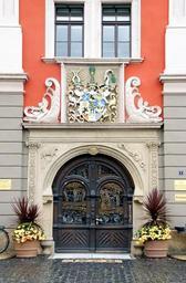 Keywords: portal door input goal old door gate ornament red historically wood coat of arms