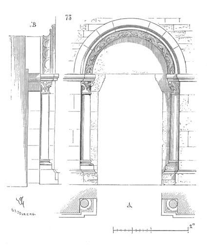 | Keywords: Porte.eglise.Beaune.png Sur le flanc sud de la nef de l'église de Beaune on voit encore une fort jolie porte de ce genre parfaitement conservée Les pieds-droits sont accompagnés de deux colonnettes et l'archivolte est ornée d'un gros boudin sculpté fig 73 Cette porte date de 1140 environ En A nous en donnons le plan et en B la coupe Cette porte possédait deux vantaux Viollet-le-Duc Portals Viollet-le-Duc Romanesque architecture Viollet-le-Duc | ||||