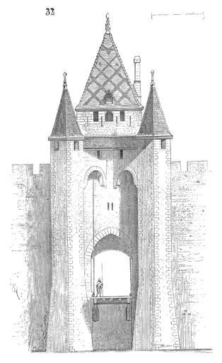 | Keywords: Porte.Villeneuve.sur.Yonne.2.png l'élévation extérieure de la porte de Villeneuve-sur-Yonne Cette élévation fait saisir la double fonction des mâchicoulis obliques Toute cette construction est élevée en cailloux de meulière avec chaînes de pierre aux angles Elle est bien traitée et les mortiers en sont excellents C'est peut-être à la bonté de cette construction et au peu de valeur des matériaux que nous devons sa conservation Une coupe longitudinale faite sur la partie antérieure de la porte fig 33 fait voir la manœuvre du pont-levis et son mécanisme Des contre-poids suspendus en arrière des deux longrines du tablier facilitaient son relèvement lorsqu'on appuyait sur le treuil T La première herse abaissée le mâchicoulis qui la protége était ouvert aux défenseurs Dans cet exemple comme dans tous ceux précédemment donnés la défense n'agit que du sommet de la porte et par la disposition des échauguettes et des grands mâchicoulis obliques le fossé ainsi que les abords du pont pouvaient être couverts de projectiles Viollet-le-Duc Portes de Sens et de Joigny Gothic portals |