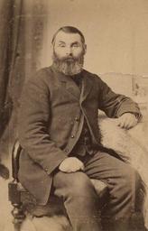 | Keywords: portraits people monochrome Photographer: Reuben R. Sallows (1855 - 1937) Description: Studio portrait of bearded man, three-quarters view, facing front, seated on chair; wears dark jacket with top button fastened, vest and pants, dark hair, full beard and moustache; dark curtain to right of subject; R. Sallows, Fotographo, Goderich imprint across bottom; (written across bottom William Green) Object ID : 0352-rrs-ogohc-ph View additional photographs by Sallows that are held in other collections at the Reuben R. Sallows Digital Library. Order a higher-quality version of this item by contacting the Huron County Museum (fee applies). Photographer: Reuben R. Sallows (1855 - 1937) Description: Studio portrait of bearded man, three-quarters view, facing front, seated on chair; wears dark jacket with top button fastened, vest and pants, dark hair, full beard and moustache; dark curtain to right of subject; R. Sallows, Fotographo, Goderich imprint across bottom; (written across bottom William Green) Object ID : 0352-rrs-ogohc-ph View additional photographs by Sallows that are held in other collections at the Reuben R. Sallows Digital Library. Order a higher-quality version of this item by contacting the Huron County Museum (fee applies). |