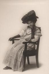 Keywords: portraits women monochrome Photographer: Reuben R. Sallows (1855 - 1937) Description: Studio portrait of young woman seated in arm chair; wearing light-coloured dress with dark flocking, large dark hat, long black leather gloves and ornate bracelet on right arm; one dark shoe visible at right; plain white backdrop; Sallows imprint on lower right corner; photo encased in dark grey folio, lined with thin sheet of spider-web textured paper, folio has swastika in upper left corner of cover; (Museum notes identify subject as Florence Sallows) Object ID : 0353-rrs-ogohc-ph View additional photographs by Sallows that are held in other collections at the Reuben R. Sallows Digital Library. Order a higher-quality version of this item by contacting the Huron County Museum (fee applies). Photographer: Reuben R. Sallows (1855 - 1937) Description: Studio portrait of young woman seated in arm chair; wearing light-coloured dress with dark flocking, large dark hat, long black leather gloves and ornate bracelet on right arm; one dark shoe visible at right; plain white backdrop; Sallows imprint on lower right corner; photo encased in dark grey folio, lined with thin sheet of spider-web textured paper, folio has swastika in upper left corner of cover; (Museum notes identify subject as Florence Sallows) Object ID : 0353-rrs-ogohc-ph View additional photographs by Sallows that are held in other collections at the Reuben R. Sallows Digital Library. Order a higher-quality version of this item by contacting the Huron County Museum (fee applies).