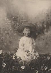 | Keywords: children portraits people monochrome outdoor Photographer: Reuben R. Sallows (1855 - 1937) Description: Full length studio portrait of small girl kneeling, facing front; wears big straw hat, light long-sleeved empire waist dress with lace cuffs; holds bouquet of daisies; foreground of grass and daisies; painted floral backdrop; Sallows imprint in bottom right corner of matte; writing in pencil on back identifies subject as Florence Sallows Saunders Object ID : 0397-rrs-ogohc-ph View additional photographs by Sallows that are held in other collections at the Reuben R. Sallows Digital Library. Order a higher-quality version of this item by contacting the Huron County Museum (fee applies). Photographer: Reuben R. Sallows (1855 - 1937) Description: Full length studio portrait of small girl kneeling, facing front; wears big straw hat, light long-sleeved empire waist dress with lace cuffs; holds bouquet of daisies; foreground of grass and daisies; painted floral backdrop; Sallows imprint in bottom right corner of matte; writing in pencil on back identifies subject as Florence Sallows Saunders Object ID : 0397-rrs-ogohc-ph View additional photographs by Sallows that are held in other collections at the Reuben R. Sallows Digital Library. Order a higher-quality version of this item by contacting the Huron County Museum (fee applies). |