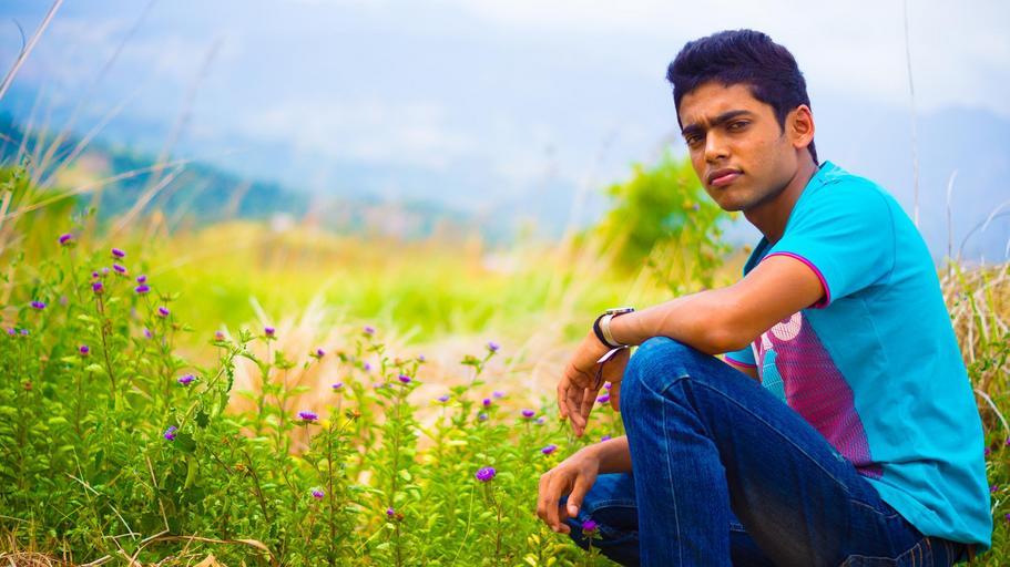 Keywords: portrait male teen boy man model outdoors field meadow serious scowling stern adult young casual flowers