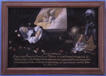 | Keywords: Porträtt, Wilhelm av Sachsen-Weimar - Skoklosters slott - 56416.tif Wilhelm av Sachsen-Weimar hertig plain text Lit de parade med huvudet åt vänster <br/><br/>Långt gråsprängt hår mustasch och kort pipskägg <br/><br/>Svart dräkt med vita ärmar och vit nedliggande krage <br/><br/>Svartdraperat rum med strödda rosor och tulpaner m fl blommor kring den döde <br/><br/>Liten blombukett i händerna på bröstet <br/><br/>I fönstret ängel med guldkrona och palmkvist <br/><br/>Vid fotändan jordglob två böcker fästningsritning tekniska instrument och rustning i en grupp <br/><br/>Målad inskrift Trauringe Abbildung des Durchl Hochgeb Fyrsten Und Herrn Herren Wilhelm des Vierden Hartzog Zu Sachsen Iylle Und Berg Landgr im Thyr Magckgr zu Meissen gefyrster Graf zu Henneb GR ZU DER Marck und Ravensverck herr zu Ravenstein Segebo zu Altenvärck den 11 Apr 1598 gestrob zu Weim den 17 Maij 1662 beij gesetz in der Schloss Kirchen den 24 Junij 1662 <br/><br/>Spikad direkt på rödbrunmålad fururam bredd 45 mm original caption Porträtt Wilhelm av Sachsen-Weimar SKO 11733 1662 oil on canvas size mm 670 440 SKO I sömnens famn - Bädd och bolster på Skoklosters slott 2010 Skoklosters slott place of origin original filename sm_t08893 32730 inventory number SKO 11733 56416 PD Samuel Uhrdin Samuel Uhrdin Deathbed portraits Media contributed by LSH 2013-10 |