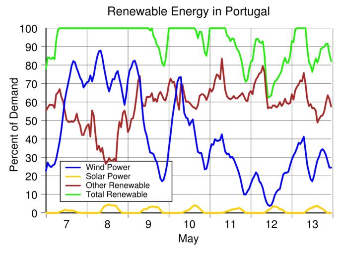 | Keywords: Portugal renewable energy production May 7-13 2016.svg translate yes en For two days during the week of April 17-23 2016 all of the electricity used in Portugal was generated from renewable energy A peak of 122 of demand was produced from renewable energy from 6 to 7 am on April 19 Excess electricity was exported when generation exceeded 100 of demand Despite being one of the sunniest countries in Europe solar power is relatively undeveloped in Portugal Data source https //transparency entsoe eu/generation/r2/actualGenerationPerProductionType/show entsoe 2016-07-12 own Delphi234 other versions Generated with Wikimedia SVG Chart SVG Chart/box cc-zero Solar energy in Portugal Wind power in Portugal Renewable energy in Portugal April 2016 in Portugal |