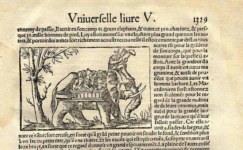 | Keywords: Porus's elephant cavalry.jpg en Porus ™s elephant cavalry according to Munster ™s famous Cosmographia 1544 Source ebay Apr 2004 Woodcut leaf from Cosmographia 1544 by Sebastian Münster French edition; Basel printing house of Sebastian Heinrich-Petri 1552 Book V pages 1329/30 This leaf from the early French edition of Cosmographia is devoted conquest of India by Alexander the Great It describes the greatest of Alexander's battles in India against Porus one of the most powerful Indian leaders - the rajah of the lands between the Jhelum and the Chenab rivers in the Punjab The battle took place in July 326 B C E at the river Hydaspes After facing the Indians for days across an unfordable river Alexander by using diversionary tactics managed to cross the stream above their camp More troublesome to Alexander than the numerical superiority of Porus' 34 000-man army were the 200 elephants that threatened the effectiveness of the Macedonian cavalry During the battle Alexander overwhelmed Porus' left wing forcing it back upon the elephants which panicked and plunged riderless into the Indian ranks The Macedonian phalanx then routed the enemy Alexander captured Porus and like the other local rulers he had defeated allowed him to continue to govern his territory Alexander even subdued an independent province and granted it to Porus as a gift The leaf contains one excellent woodcut picture 3 x 4 of a military unit consisting of an elephant carrying a group of soldiers 1544 http //www columbia edu/itc/mealac/pritchett/00routesdata/bce_399_300/alexander/alexander html Munster Porus's elephant cavalry Cosmographia 1544 jpg PD-old-100 Cosmographia Elephant riding in art War elephants of India 16th-century woodcuts Porus 1540s works Uploaded with UploadWizard People with elephants in India |