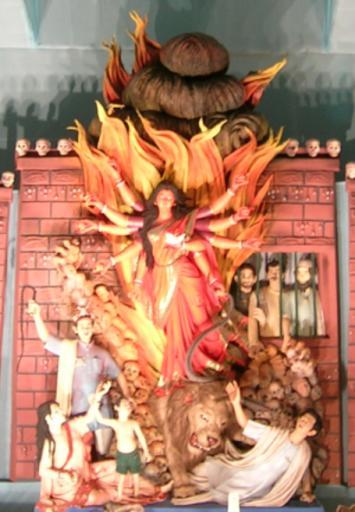 Keywords: Post-modern depiction of Durga.png Post-modern symbolic depiction of Durga with the three religions of India watching from behind bars while Durga attacks what looks like a Bengali gentleman but is presumably a symbolism for evil The symbolic role of the family standing to the left is unclear Photographed at Mohammad Ali Park Calcutta Transferred from http //en wikipedia org en wikipedia; transferred to Commons by User Kelly using http //tools wikimedia de/~magnus/commonshelper php CommonsHelper 2004-10-19 Mukerjee at http //en wikipedia org en wikipedia PD-AUTHOR; Released into the public domain by the author Mukerjee Original upload log page en wikipedia S325_durga-5_md-ali-park-modern png 2004-11-10 07 05 Mukerjee 300×433× 235144 bytes <nowiki>Traditional Durga idol with four children Photographed in N Calcutta Pandal Oct 19 2004</nowiki> Durga Puja idols Culture of Kolkata |