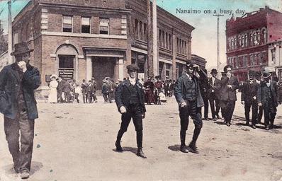 | Keywords: outdoor "Nanaimo on a busy day." Canadian Souvenir Post Card. Published for A. C. van Houten, Nanaimo, B. C. Warwick Bro's & Rutter, Limited, Publishers, Toronto. View looking north up Commercial Street from the 200-block and into the 000-block of Church Street (right) in Nanaimo, BC on Vancouver Island. "Nanaimo on a busy day." Canadian Souvenir Post Card. Published for A. C. van Houten, Nanaimo, B. C. Warwick Bro's & Rutter, Limited, Publishers, Toronto. View looking north up Commercial Street from the 200-block and into the 000-block of Church Street (right) in Nanaimo, BC on Vancouver Island. |